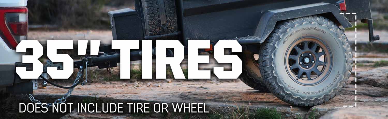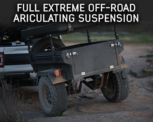 With a towering clearance of 29.5" when fitted with 35" tires, this trailer offers remarkable off-road capabilities. Its suspension, featuring a dual trailing arm, linear coil spring, and dual shock setup per corner, is designed to tackle extreme off-roading while providing a remarkably smooth ride on the road. The trailer weighs 1100 LBS. without wheels and tires, and around 1250 LBS. with wheels and tires.